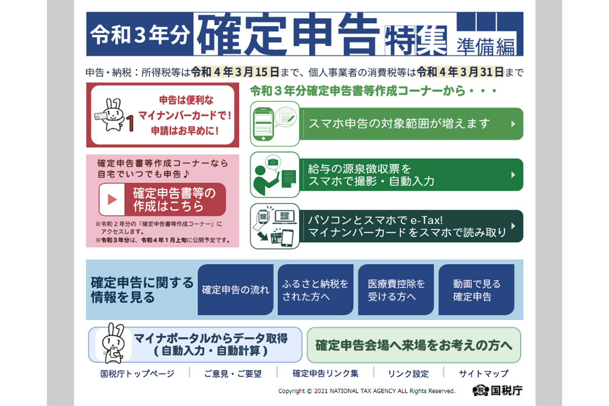 国税庁は、「令和3年分 確定申告特集(準備編)」を2021年12月1日に開設した。令和3年分確定申告では、スマホ申告の対象範囲が拡大。特定口座年間取引報告書(上場株式等の譲渡所得等・配当所得等)、上場株式等の譲渡損失額(前年繰越分)、外国税額控除が、スマホの画面の大きさに適したレイアウトで表示され、入力しやすくなるとしているという。