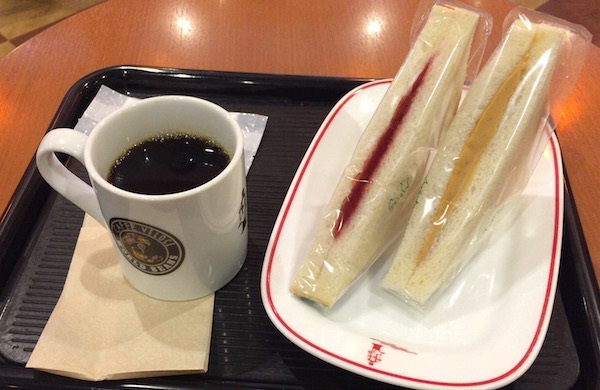 ブレンドコーヒーとサンドイッチ2個(苺ジャム・ピーナッツ、それぞれハーフ)で420円がおすすめ。