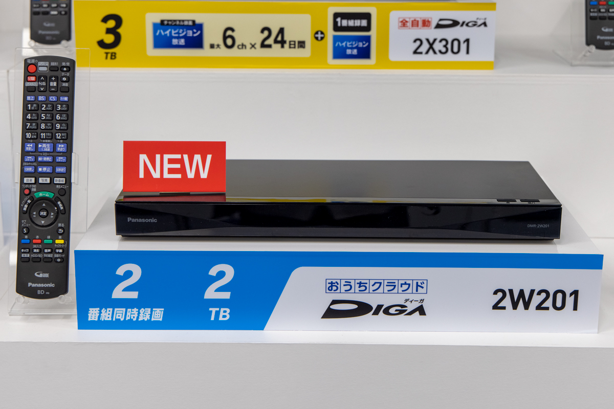 パナソニックは、2Kチューナー搭載のレコーダー・ディーガの新モデルとして「DMR-2W201」「DMR-2W101」「DMR-2W51」の3機種を2021年6月中旬に発売する。価頭予想価格は2TB HDD内蔵の「2W201」が66,000円前後、1TBの「2W101」が59,000円前後、500GBの「2W51」が51,000円前後。3機種共通の進化点として、番組表の快適度がアップ。従来モデルは8日間分の番組をスクロールするために約33秒かかっていたが、約15秒と高速化したという。