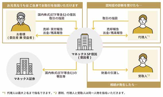 マネックス証券は、マネックスSP信託が提供する認知症や相続に備える株式管理サービス「たくす株」の取扱いを開始する。「たくす株」は、顧客が保有する国内上場株式を「たくす株専用口座」で預かり、顧客が認知症になった場合には信託契約に基づいて家族が売却・出金をできるように設計されたサービス。たくす株の信託金額は100万円からで、初回の契約時や、追加の信託設定時の手数料は無料だという。
